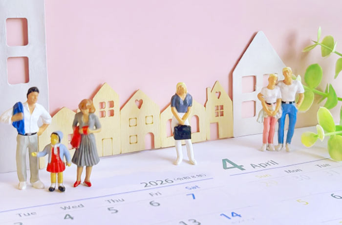 春の新生活シーズンをイメージしたミニチュアの家族と住宅模型